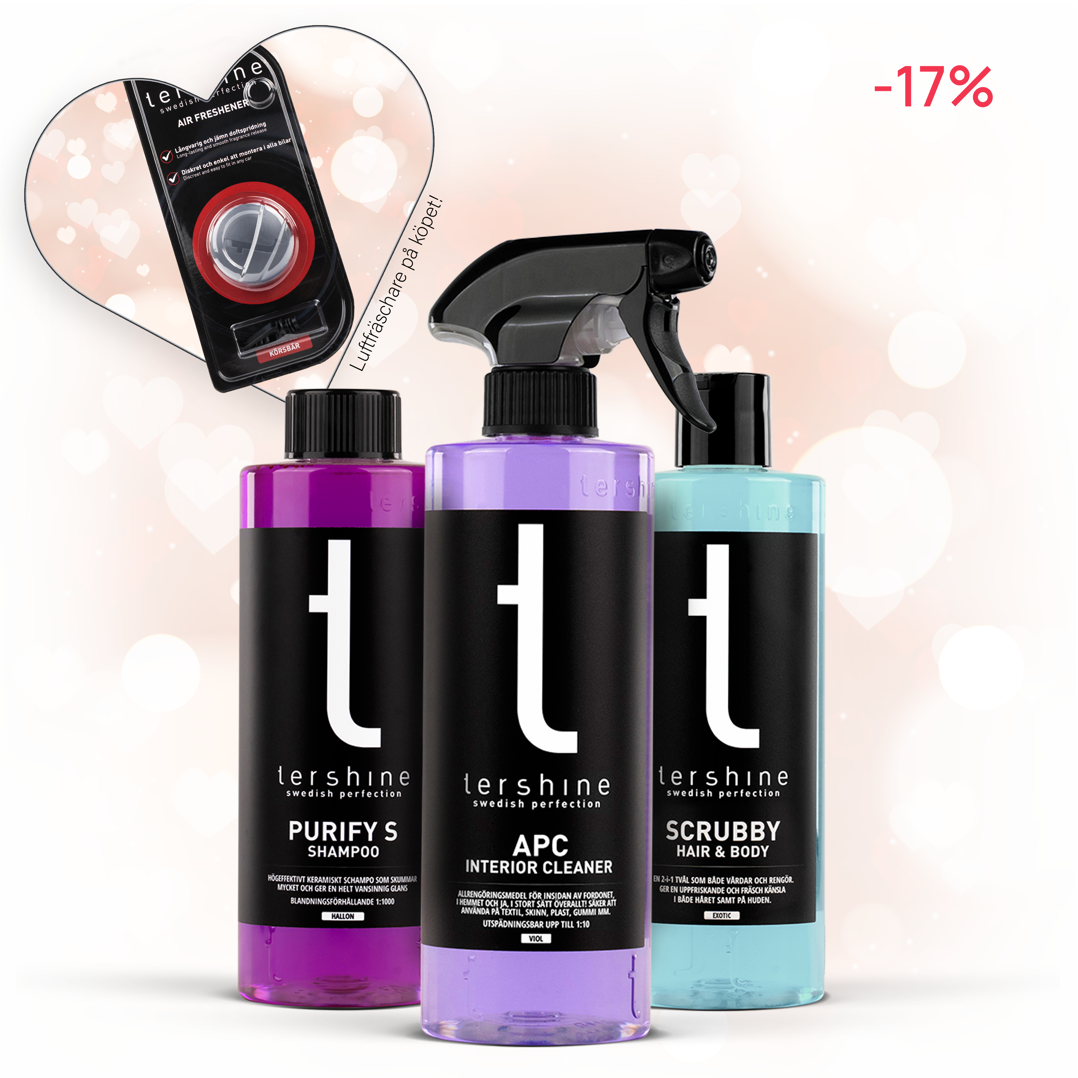 Ge någon du tycker om ett kit för bilens insida, utsida och kroppen. Ett färdigt Alla hjärtans dag-paket där vi skickar med en luftfräschare i valfri doft på köpet!