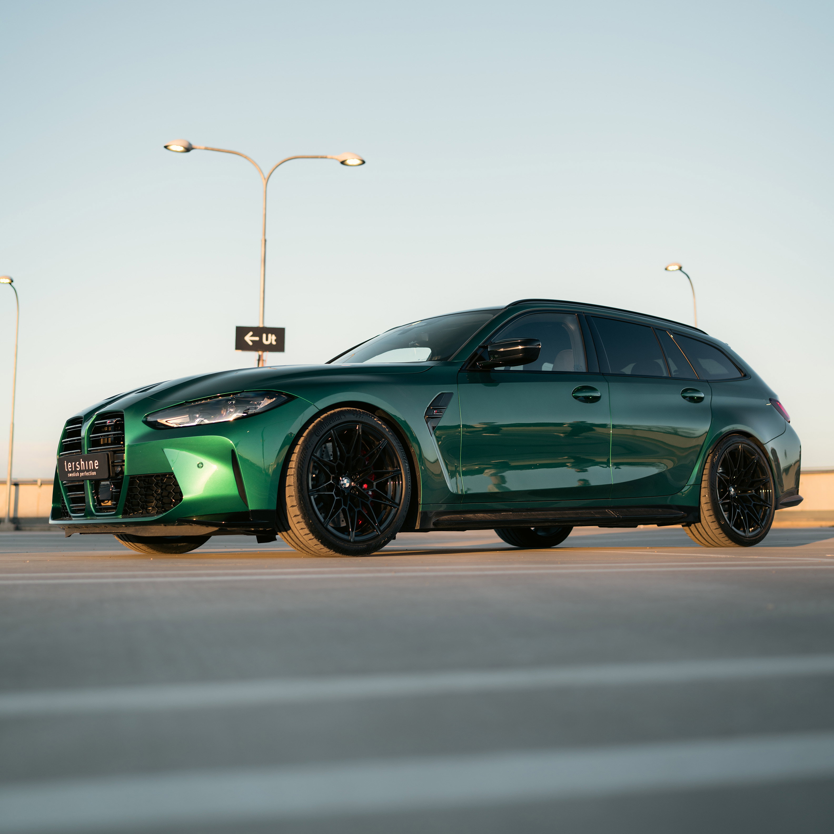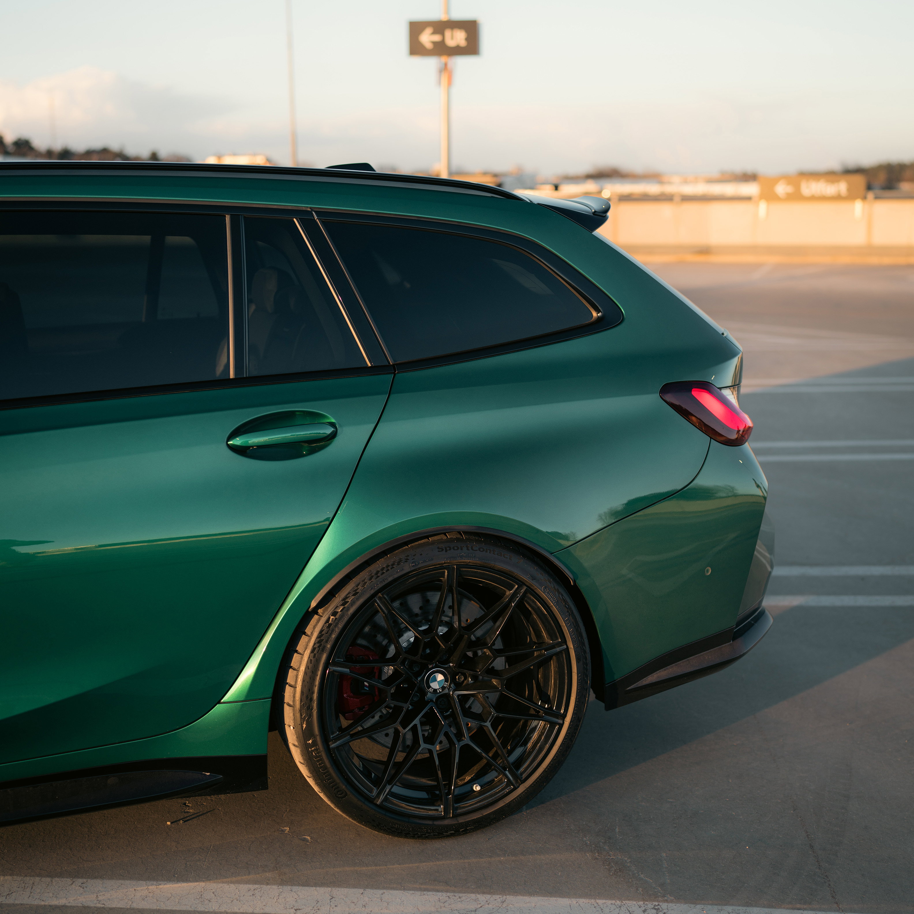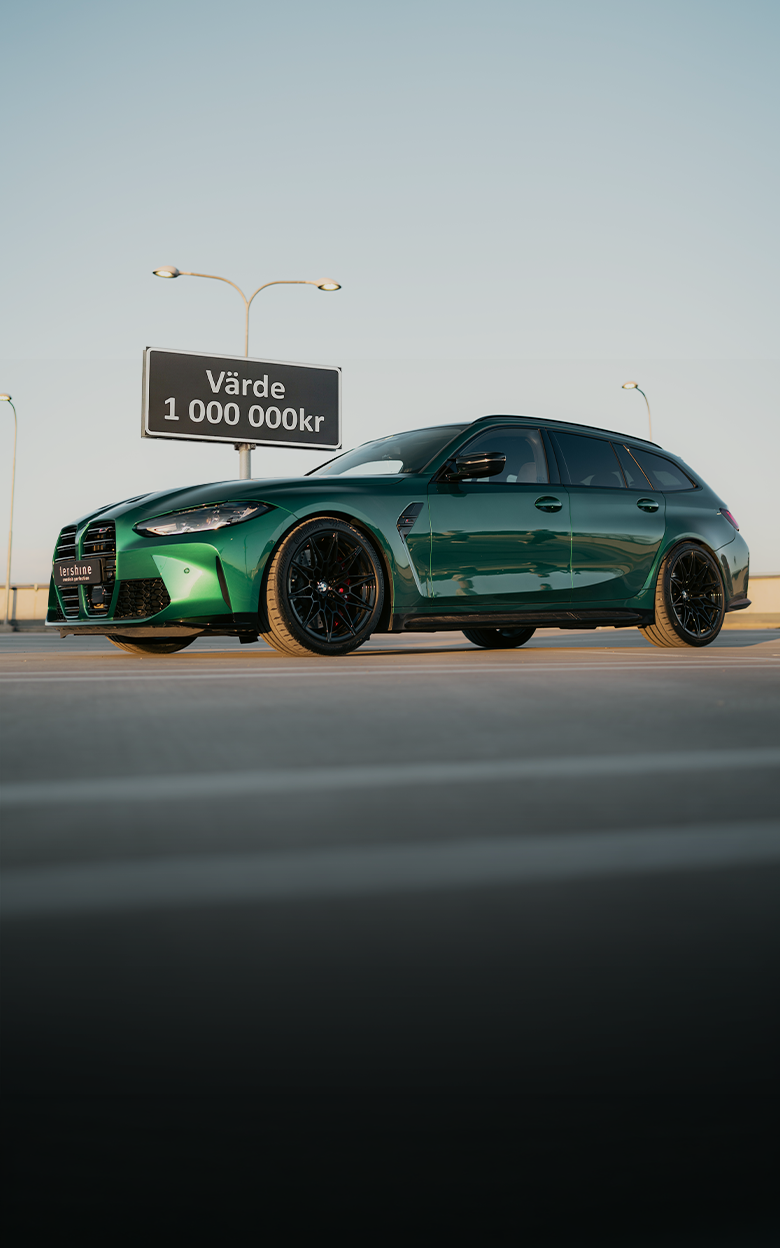 En svingrym Isle of Man-grön BMW M3 Touring från 2024 med strax över 500 mil på mätaren. Det innebär alltså att bilen fortfarande har nybilsgaranti!