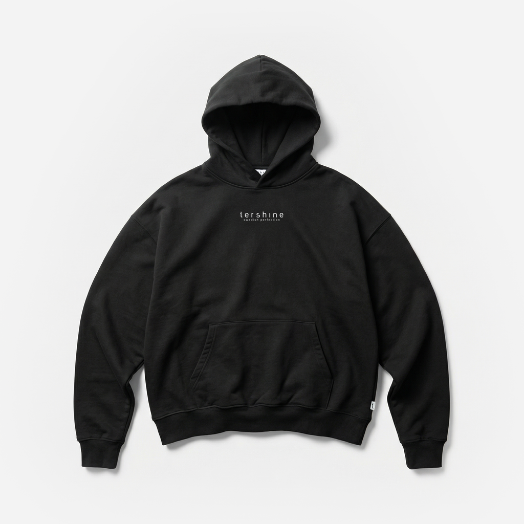 Vår helt egenutvecklade hoodie. Lutar lite åt oversized-hållet med droppade axelsömmar och stor, mysig luva. Finfin kvalitet, ca 340 gsm. litet logo-tryck över bröstet, och vävd tershine logga insydd på sidan