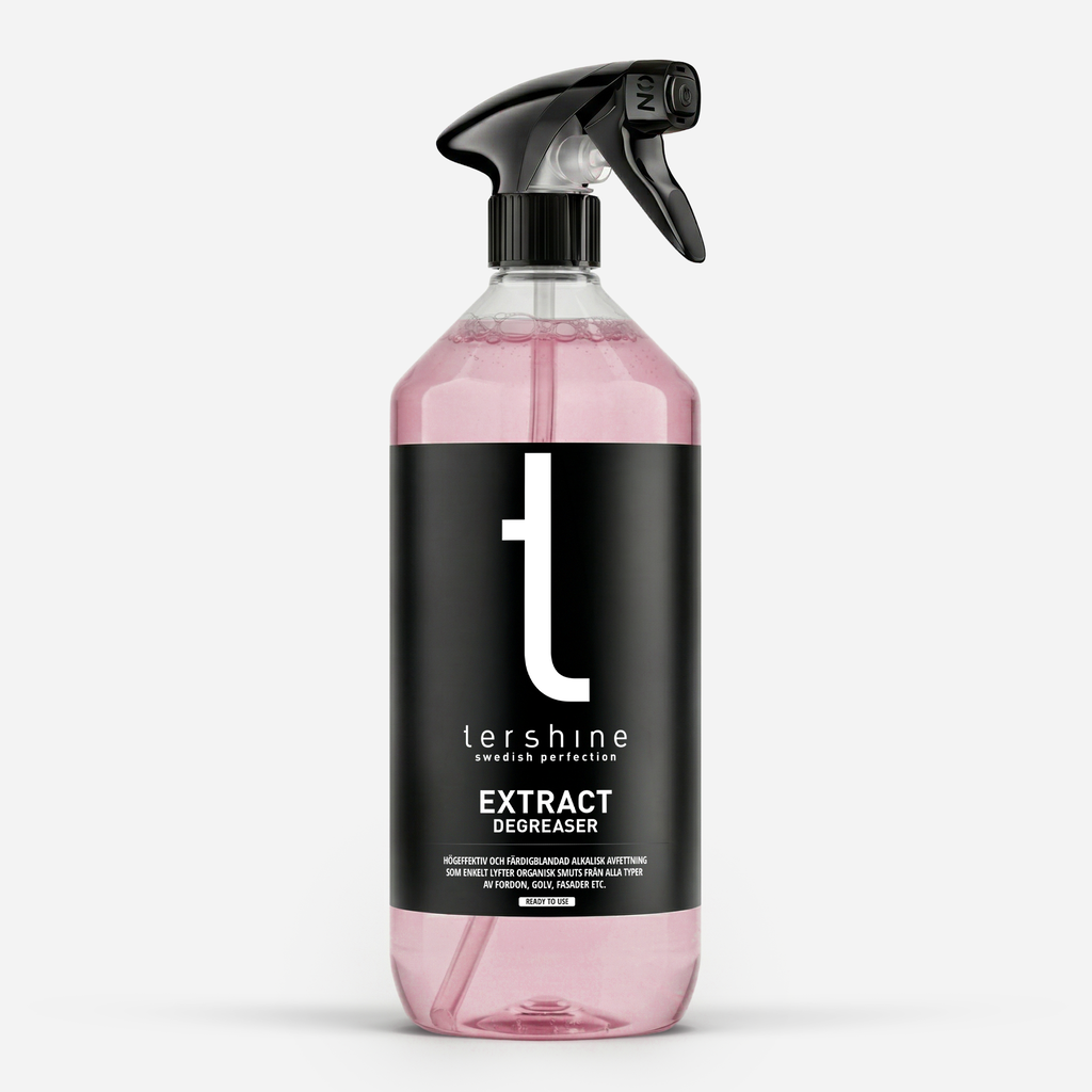 Extract - Ready To Use är en högeffektiv alkalisk avfettning lämplig för alla typer av fordon, golv, fasader etc. Lyfter organisk smuts och doftar härligt av citrus. Färdigblandad 10% i vatten och 1 liter kan således bli två om man blandar ner den till 5%. Fungerar även utmärkt för grövre smuts på golvmattor etc.