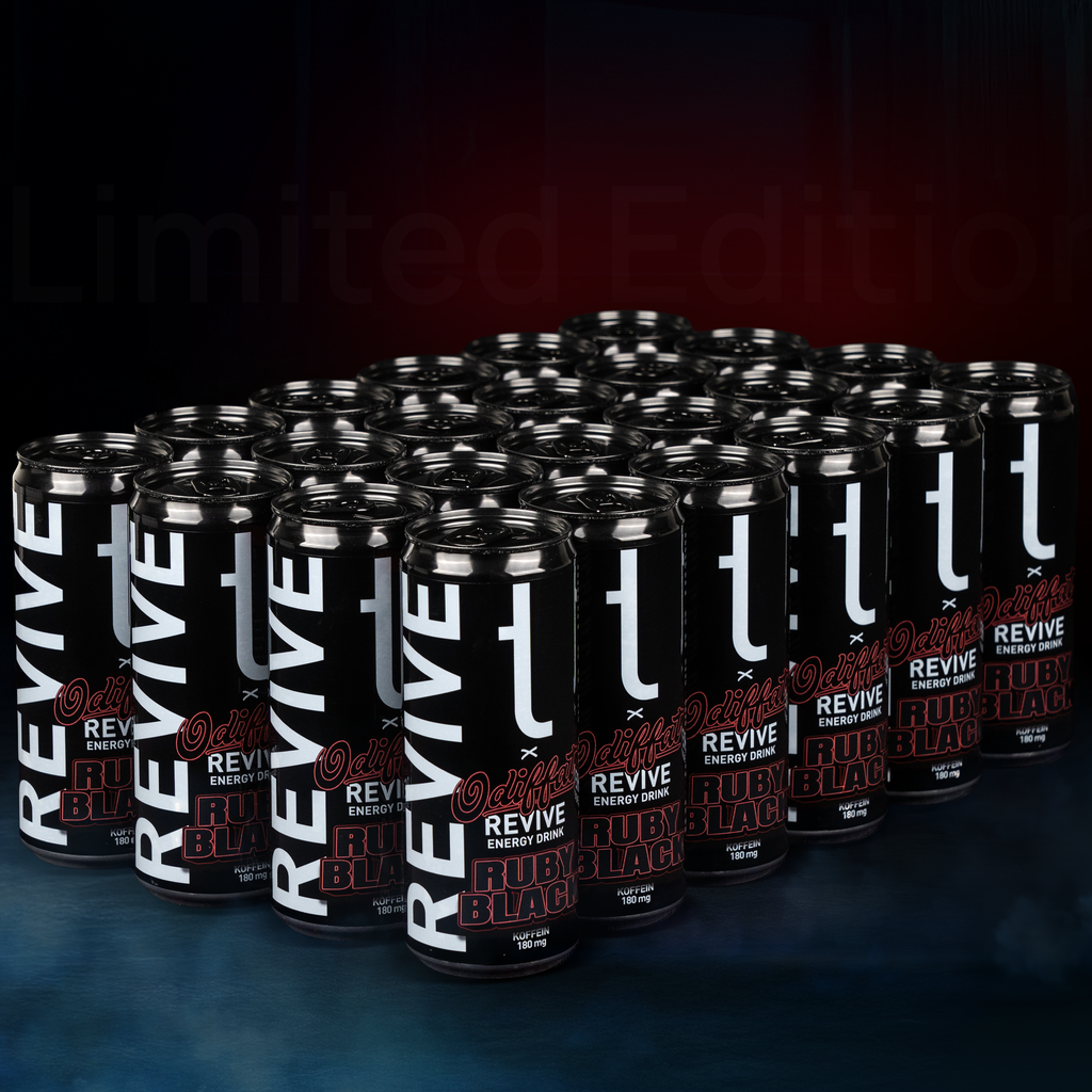 Revive x Odiffat - Ruby Black är en sockerfri uppfriskande energidryck med 180mg koffein och smak av hallon & svartvinbär. Perfekt för att snabbt boosta din energi i garaget, bakom ratten eller bara avnjuta tillsammans med ett härligt lager glossy gloss!