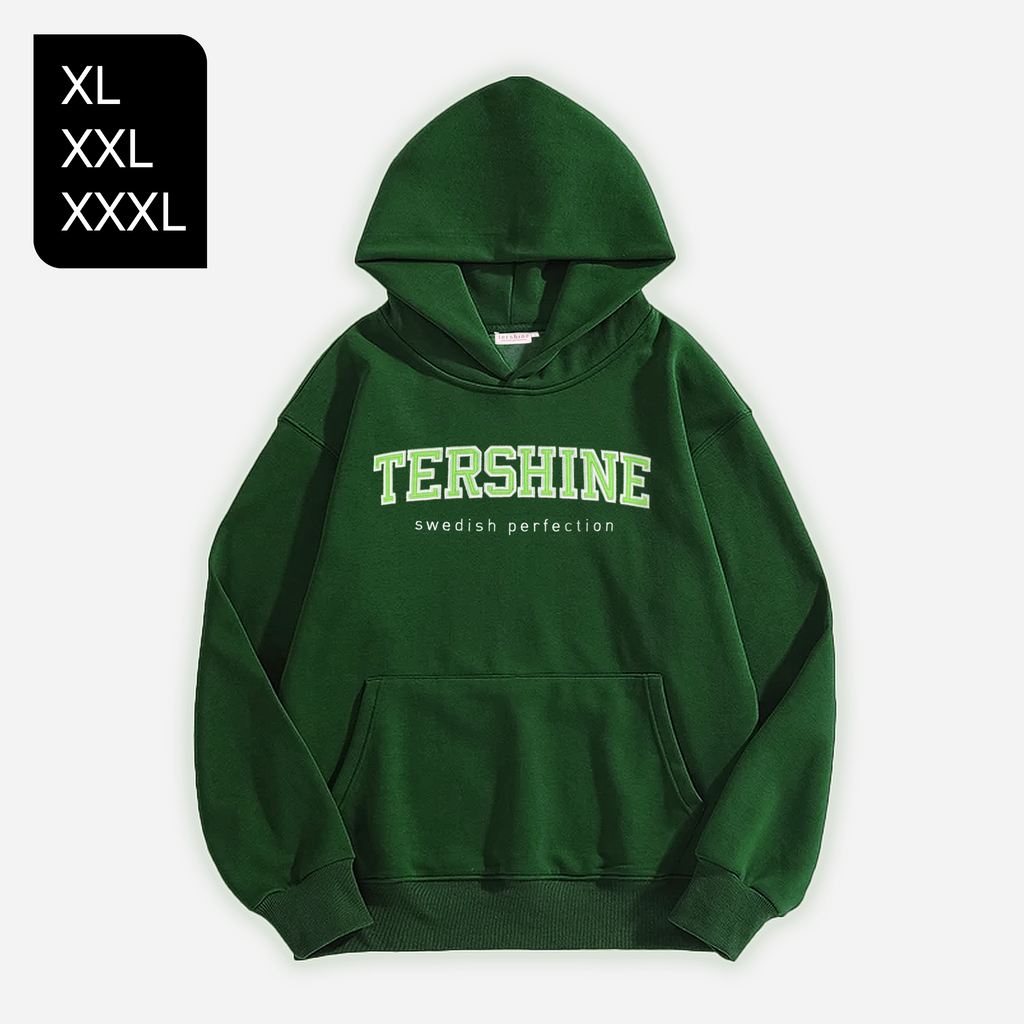Vår helt egenutvecklade hoodie i en härlig grön färg. Lutar lite åt oversized-hållet med droppade axelsömmar och stor, mysig luva. Finfin kvalitet, ca 340 gsm. Stor tershinebrodyr över bröstet, och vävd tershine logga insydd på sidan